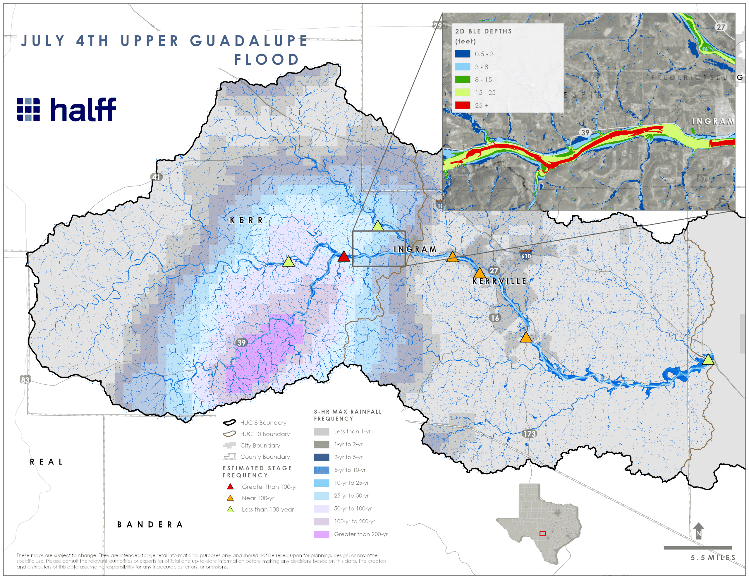 Halff leveraged newly developed, non-proprietary 2D Base Level Engineering (BLE) models — provided by FEMA Region 6 and the Texas Water Development Board (TWDB) — to perform rapid assessments of flood behavior in the Upper Guadalupe, San Gabriel and San Saba watersheds. Our team requested use of these models early to support informed evaluations of storm magnitude and flood impacts. The teams also used available datasets, including rainfall data and gage records, to evaluate how rainfall contributed to flood movement.