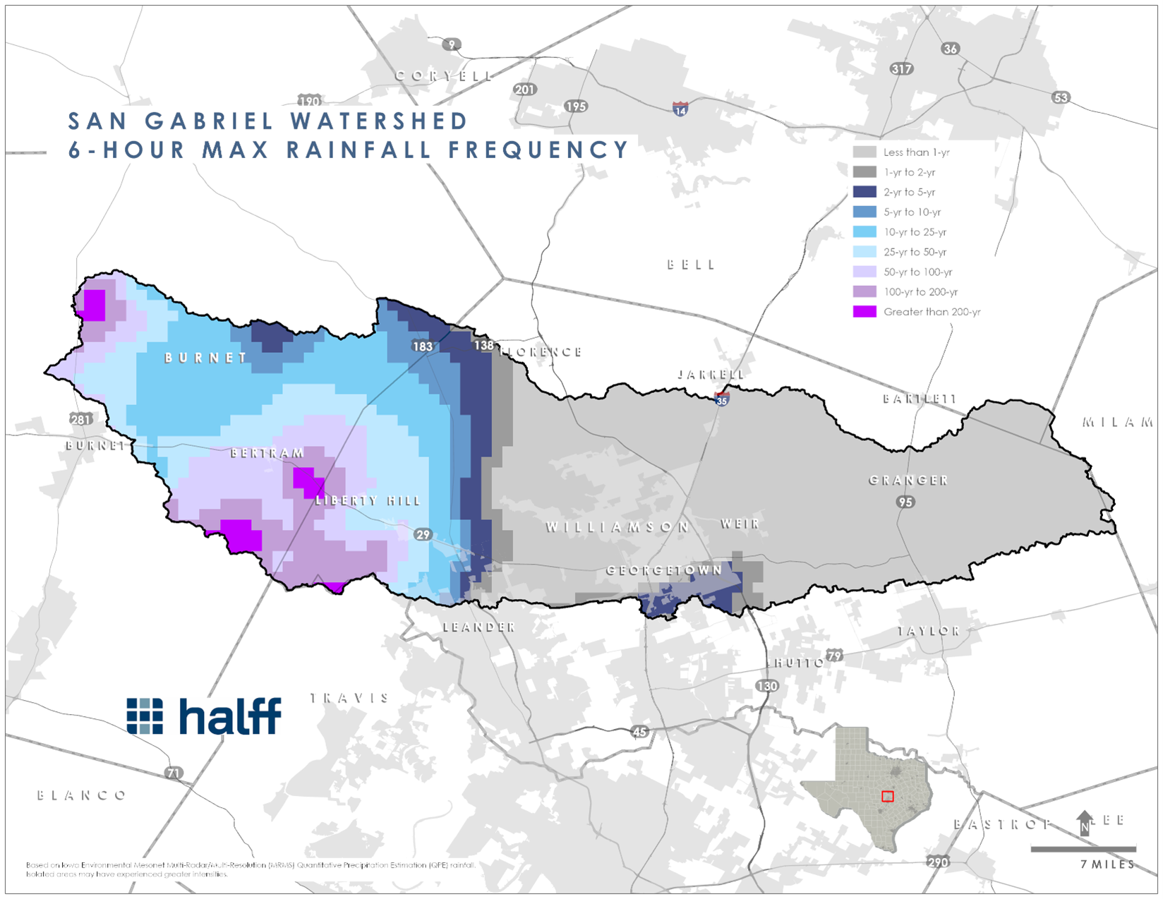 The upstream portion of the San Gabriel watershed, especially in the Bertram and Liberty Hill areas, experienced rainfall amounts consistent with 100-year to greater than 200-year return period events, depending on rainfall duration (ranging from three-hour to 24-hour intervals). Swift water rescues near 6 a.m. on July 5 at the Burnet and Williamson County boundary suggests a short-duration, high-intensity rainfall triggered this event.