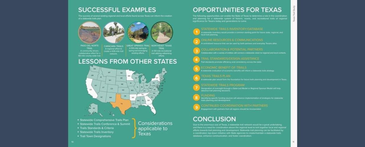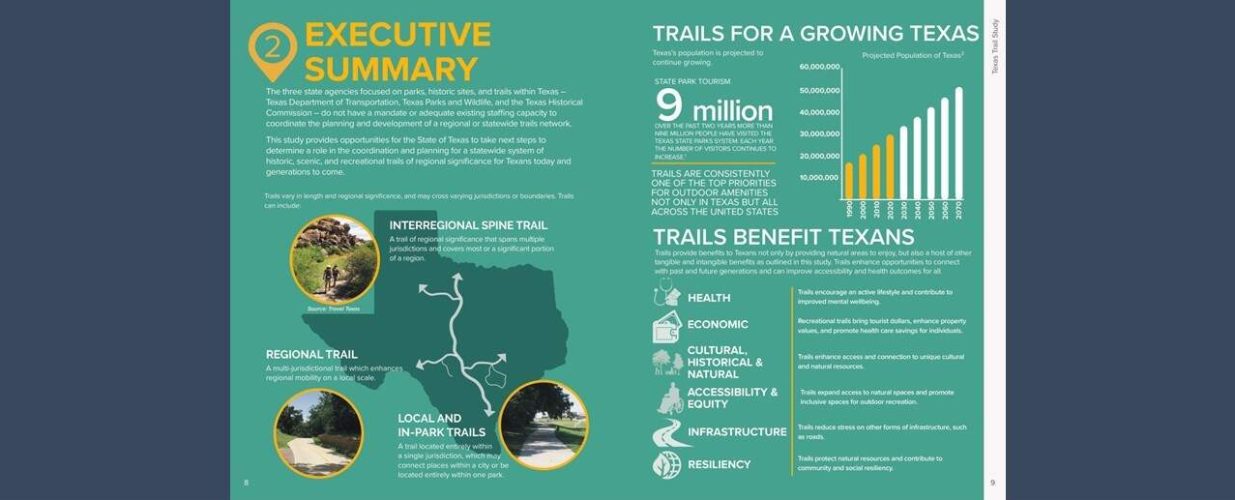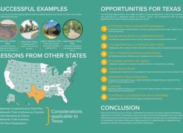 Trails have long been a part of Texas’ history. A burgeoning population has fueled Texans’ interest in developing trails across the State. The Texas Trails Study is an unusual, one-of-a-kind planning effort, purposefully intended to make a case for how the State of Texas, through its key agencies, could create a statewide trails plan and strategy to enhance trail planning and development across Texas.